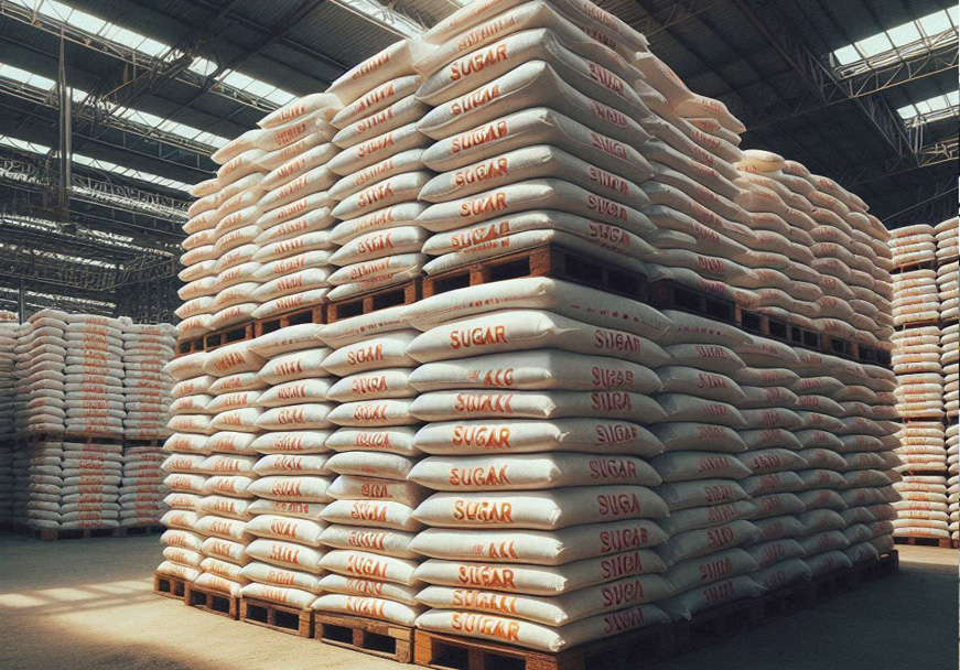 Sugar bags resting in the storage facility.
